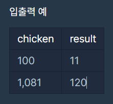 프로그래머스 치킨은 치킨을 시켜먹으면 한 마리당 쿠폰을 한 장 발급합니다. 쿠폰을 열 장 모으면 치킨을 한 마리 서비스로 받을 수 있고, 서비스 치킨에도 쿠폰이 발급됩니다. 시켜먹은 치킨의 수 chicken이 매개변수로 주어질 때 받을 수 있는 최대 서비스 치킨의 수를 return하도록 solution 함수를 완성해주세요.