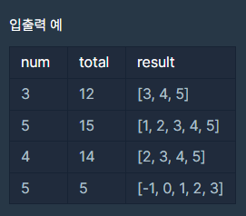 연속된 세 개의 정수를 더해 12가 되는 경우는 3, 4, 5입니다. 두 정수 num과 total이 주어집니다. 연속된 수 num개를 더한 값이 total이 될 때, 정수 배열을 오름차순으로 담아 return하도록 solution함수를 완성해보세요.